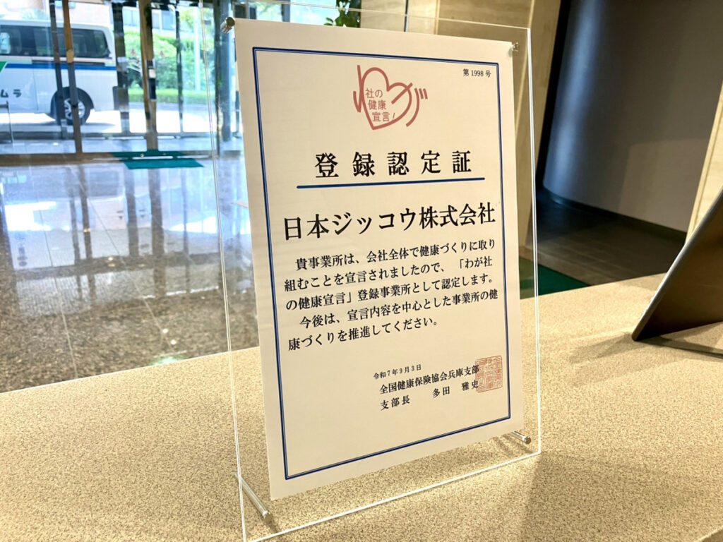 このたび弊社は、従業員の健康づくりを全社的に推進していくことを宣言し、全国健康保険協会兵庫支部より「わが社の健康宣言」登録事業者として認定されました。