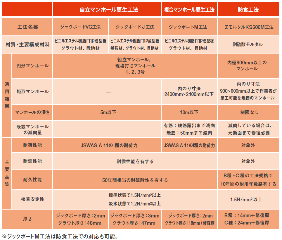自立マンホール更生工法、複合マンホール更生工法、防食工法(モルタルライニング工法)の特性比較。