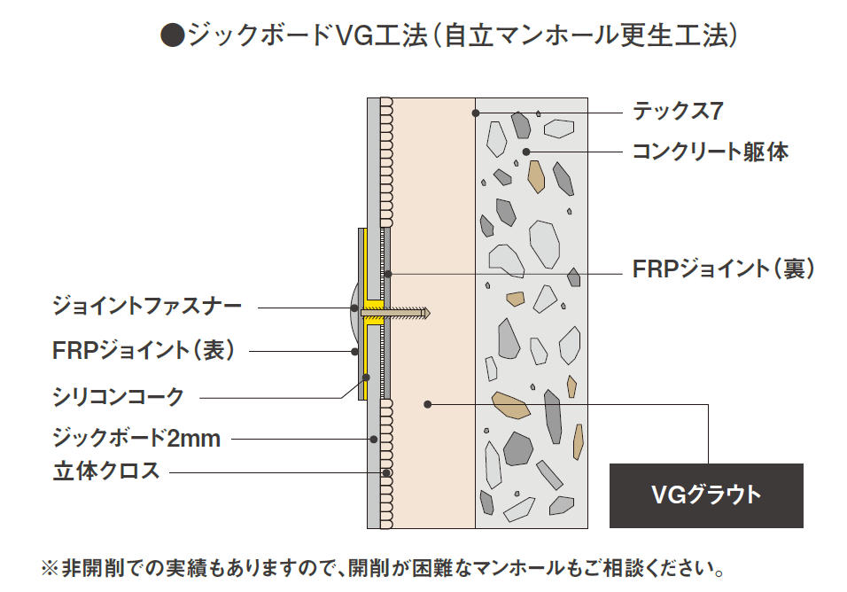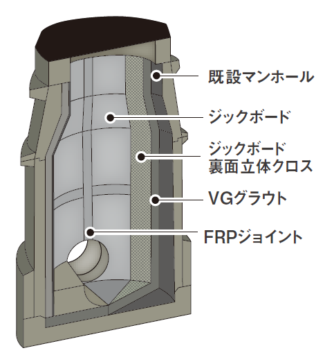 ジックボードVG工法は、非開削工法により騒音や道路交通への影響を最小限に抑えるとともに、更生材のみで外力に対抗することのできる自立マンホール更生工法です。また、従来工法の自立マンホール更生工法「ジックボードJ工法」と比較し、「ジックボードVG工法」は施工の簡略化と工程短縮を図った工法です。