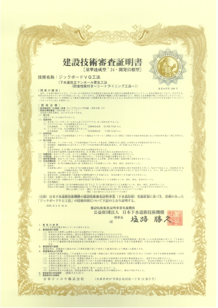 公益財団法人日本下水道新技術機構より、 建設技術審査証明(下水道技術 第2406号)を取得しました。