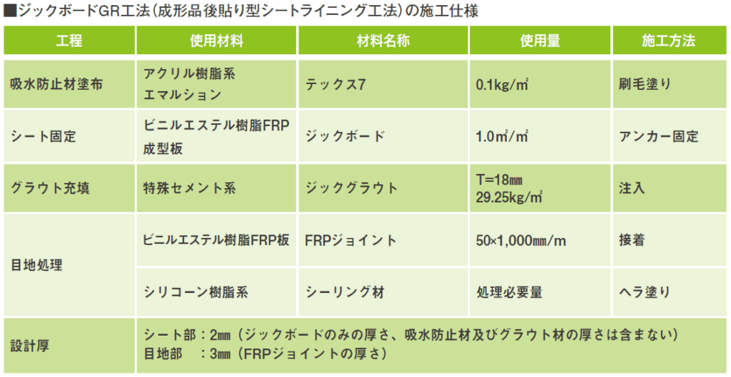 ●ジックボードGR工法の目地は、表面と裏面のFRP成型品及び耐食性シール材の三重構造とし、応力集中などによる目地部の損傷を防止する優れた耐久性機能を付与しています。