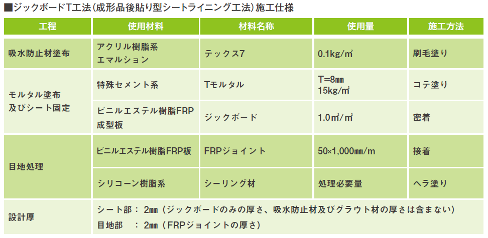 ●ジックボードT工法の目地は、FRP成型品を耐食性シール材で設置して二重構造とし、目地部の損傷を防止する耐久性機能を付与しています。